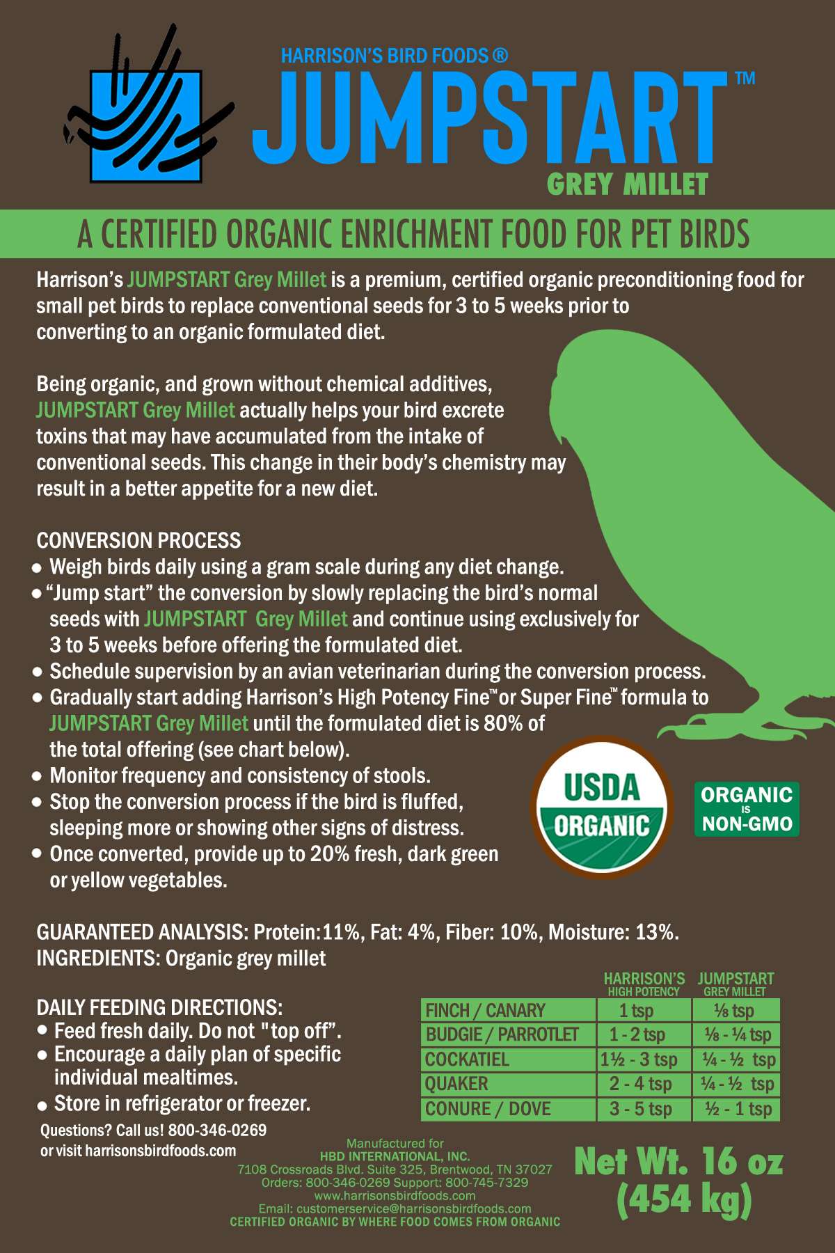 Feed JUMPSTART Grey Millet in conjunction with Harrison’s Bird Foods certified organic formulas. For small birds offer in amounts show using the chart below. For larger birds use suggested amount in a mash or grind fresh daily and add to a small amount of moist vegetable for consumption.
