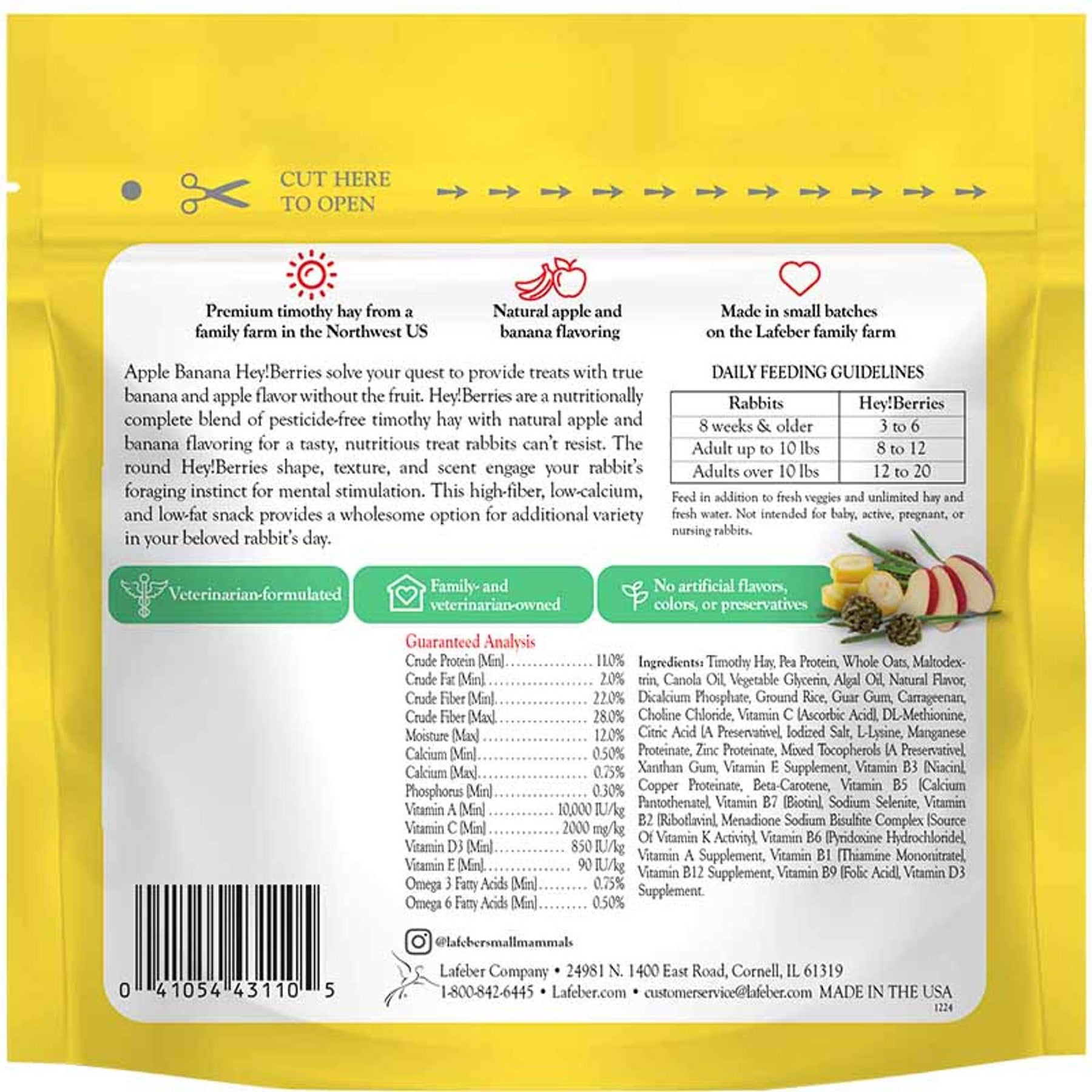 Apple Banana Hey!Berries are nutritious, timothy hay–based treats flavored with natural apple and banana for a taste rabbits love. High in fiber and low in calcium and fat, they support digestion and provide fun foraging enrichment for a healthy, happy rabbit.