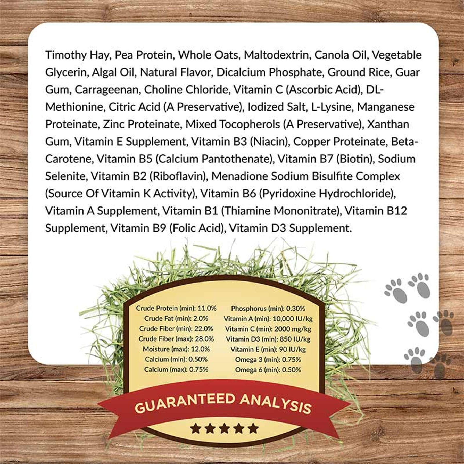 Timothy Hay, Pea Protein, Whole Oats, Maltodextrin, Canola Oil, Vegetable Glycerin, Algal Oil, Natural Flavor, Dicalcium Phosphate, Ground Rice, Guar Gum, Carrageenan, Choline Chloride, Vitamin C (Ascorbic Acid), DL-Methionine, Citric Acid (A Preservative), Iodized Salt, L-Lysine, Manganese Proteinate, Zinc Proteinate, Mixed Tocopherols (A Preservative), Xanthan Gum, Vitamin E Supplement, Vitamin B3 (Niacin), Copper Proteinate, Beta-Carotene, Vitamin B5 (Calcium Pantothenate), Vitamin B7 (Biotin), Sodium Selenite, Vitamin B2 (Riboflavin), Menadione Sodium Bisulfite Complex (Source Of Vitamin K Activity), Vitamin B6 (Pyridoxine Hydrochloride), Vitamin A Supplement, Vitamin B1 (Thiamine Mononitrate), Vitamin B12 Supplement, Vitamin B9 (Folic Acid), Vitamin D3 Supplement.