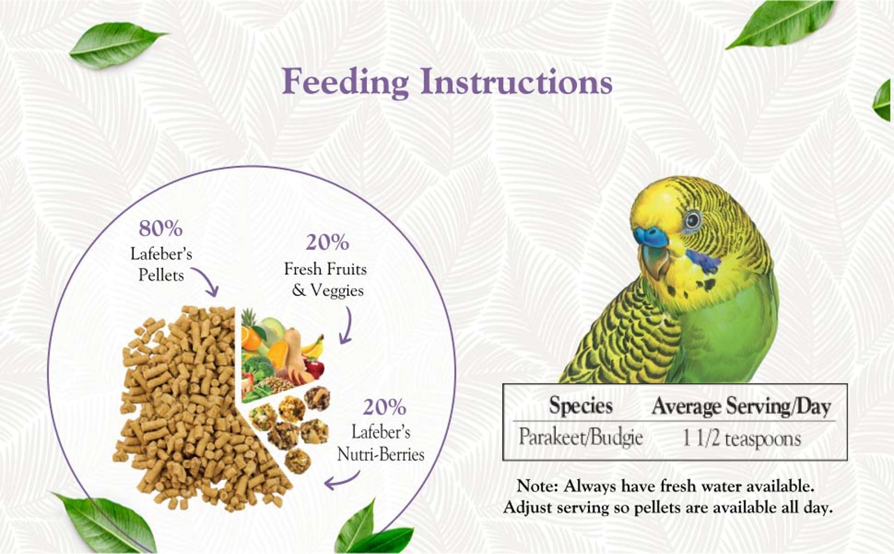 Feed as the main diet or mix with Nutri-Berries, Avi-Cakes, fruits, and vegetables for variety. Provide fresh, clean water daily. Transition gradually over 7–10 days by mixing pellets with your parakeet’s current food until fully accepted.