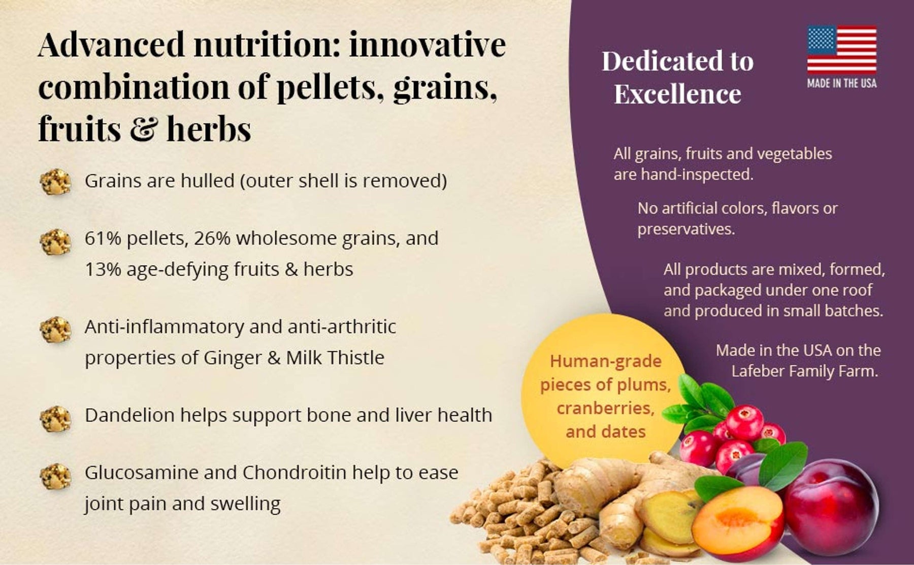 Oat Flour, Wheat Flour, Hulled White Proso Millet, Ground Corn, Wheat Bran, Maltodextrin, Oat Groats, Dried Dates, Dried Cranberries, Dried Plums, Hydrolyzed Soy Protein, Cracked Corn, Canola Seed, Safflower Seed, Peanuts, Powdered Cellulose, Dicalcium Phosphate, Corn Syrup, Corn Oil, Glycerin, Plant-Based Propylene Glycol, Canola Oil, Soybean Meal, Gelatin, Ground Limestone, Dried Whole Egg, Chondroitin Sulfate, Choline Chloride, Iodized Salt, Citric Acid (A Natural Preservative), Mixed Tocopherols For Freshness, Dandelion Root, Ginger, Milk Thistle, DL-Methionine, Vitamin E Supplement, Ascorbic Acid, Niacin Supplement, Beta Carotene, Glucosamine Sulfate, Manganese Proteinate, D-Calcium Pantothenate, Zinc Proteinate, Biotin, Riboflavin Supplement, Sodium Selenite, Pyridoxine Hydrochloride, Vitamin A Acetate, Thiamine Mononitrate, L-Lysine, Copper Proteinate, Vitamin B12 Supplement, Vitamin D3 Supplement, Folic Acid.
