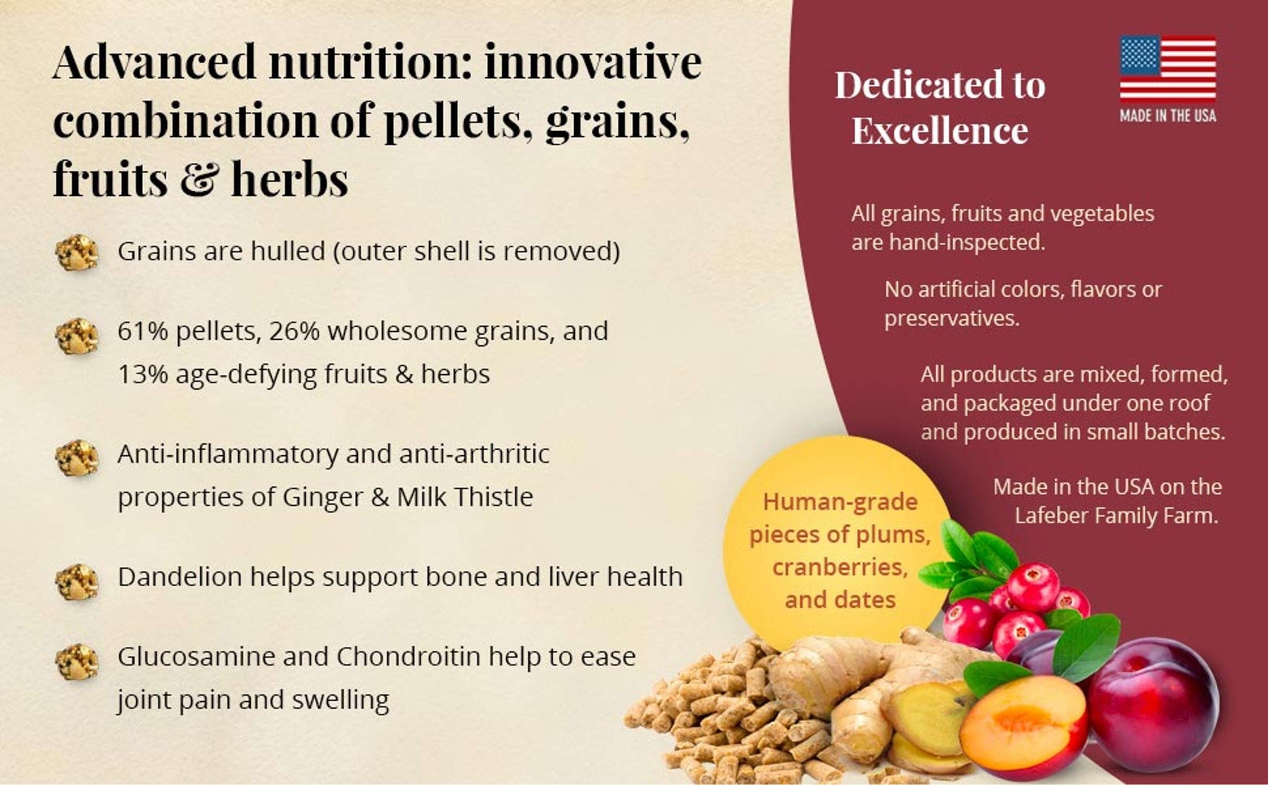Oat Flour, Wheat Flour, Ground Corn, Hulled White Proso Millet, Peanuts, Canola Seed, Red Millet, Wheat Bran, Maltodextrin, Oat Groats, Dried Dates, Dried Cranberries, Dried Plums, Hydrolyzed Soy Protein, Cracked Corn, Canola Seed, Safflower Seed, Powdered Cellulose, Dicalcium Phosphate, Corn Syrup, Corn Oil, Glycerin, Plant-Based Propylene Glycol, Canola Oil, Soybean Meal, Gelatin, Ground Limestone, Dried Whole Egg, Chondroitin Sulfate, Choline Chloride, Iodized Salt, Citric Acid (A Natural Preservative), Mixed Tocopherols For Freshness, Dandelion Root, Ginger, Milk Thistle, DL-Methionine, Vitamin E Supplement, Ascorbic Acid, Niacin Supplement, Beta Carotene, Glucosamine Sulfate, Manganese Proteinate, D-Calcium Pantothenate, Zinc Proteinate, Biotin, Riboflavin Supplement, Sodium Selenite, Pyridoxine Hydrochloride, Vitamin A Acetate, Thiamine Mononitrate, L-Lysine, Copper Proteinate, Vitamin B12 Supplement, Vitamin D3 Supplement, Folic Acid.
