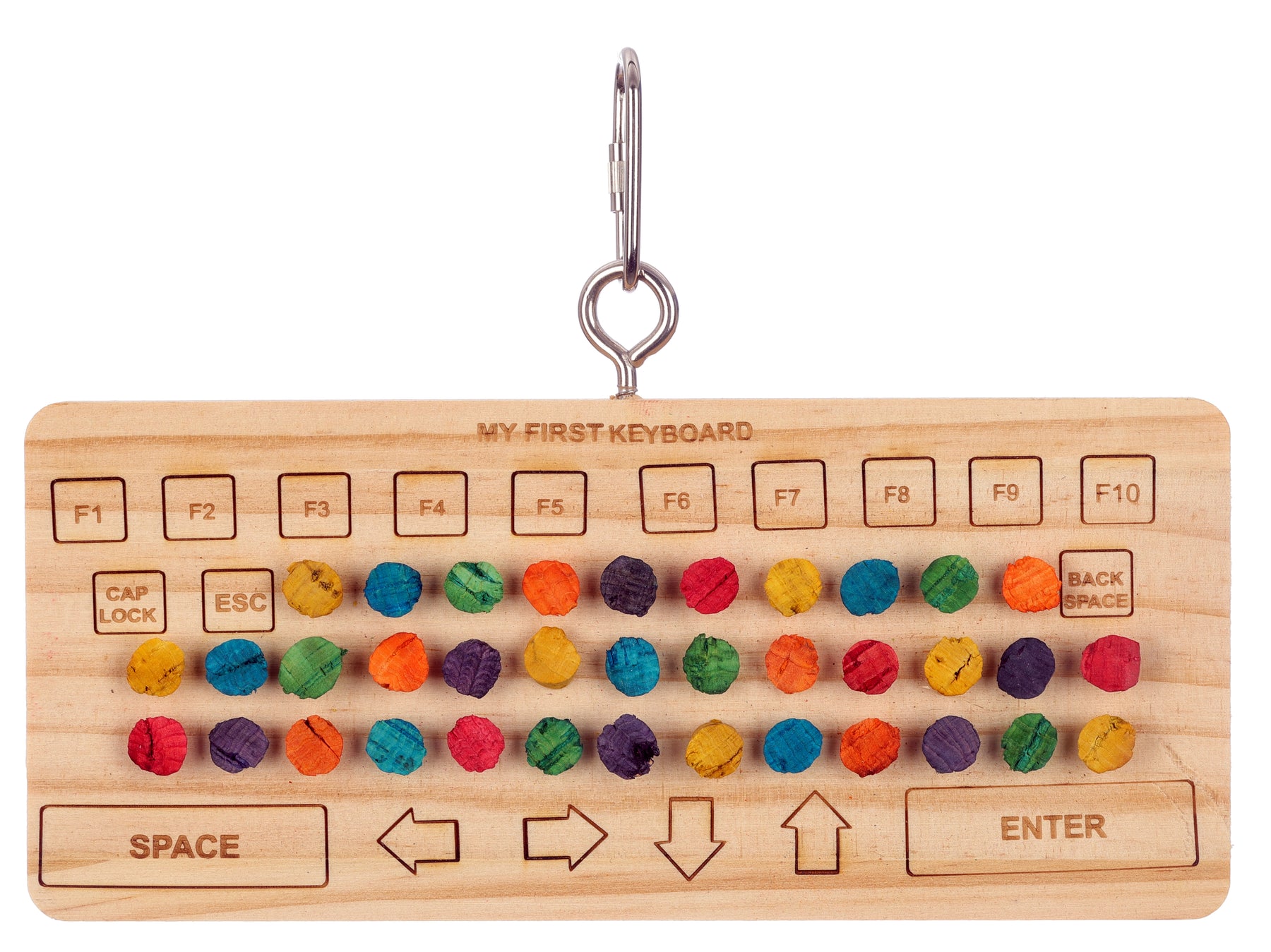 • DESIGN FEATURES - Delightful hardwood keyboard base with 36 fun-to-pluck and chew corks.  Includes a bag of 60 refill corks.  Treats can also be stuffed in the holes to create a foraging feature.  Attaches to the cage with a bird-safe pear link.