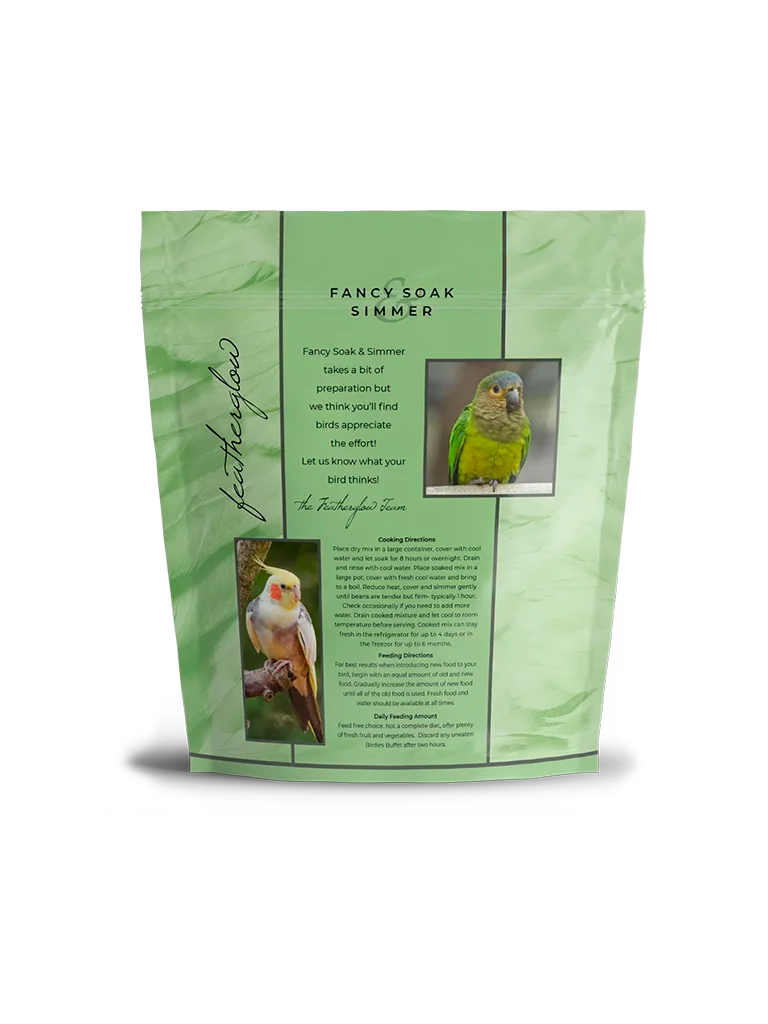 Rinse Volkman Featherglow Soak & Simmer thoroughly before use. Soak 1 part mix in 2 parts clean water for 8–10 hours or overnight, then drain and rinse again. Serve as is, or for a warm meal, simmer the soaked mix for 10–15 minutes until tender. Allow to cool before feeding. Offer as a supplement alongside your bird’s regular diet of seeds, pellets, or fresh produce. Remove any uneaten portions after a few hours to maintain freshness.