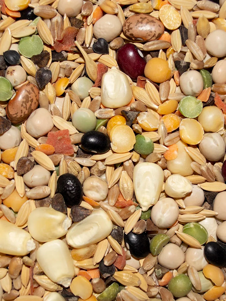 Dehydrated peas, rough rice, wheat, barley, buckwheat, corn, oat groats, lentils, beans, dehydrated carrot.