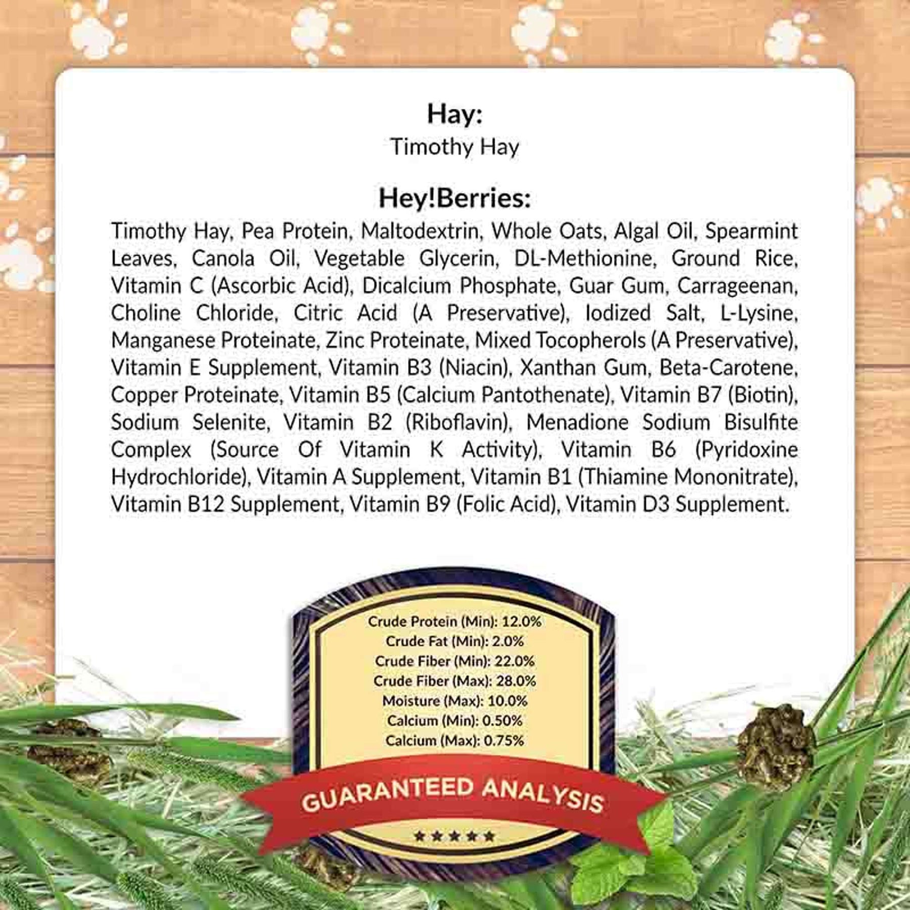 Timothy Hay, Pea Protein, Maltodextrin, Whole Oats, Algal Oil, Spearmint Leaves, Canola Oil, Vegetable Glycerin, DL-Methionine, Ground Rice, Vitamin C (Ascorbic Acid), Dicalcium Phosphate, Guar Gum, Carrageenan, Choline Chloride, Citric Acid (A Preservative), Iodized Salt, L-Lysine, Manganese Proteinate, Zinc Proteinate, Mixed Tocopherols (A Preservative), Vitamin E Supplement, Vitamin B3 (Niacin), Xanthan Gum, Beta-Carotene, Copper Proteinate, Vitamin B5 (Calcium Pantothenate), Vitamin B7 (Biotin), Sodium Selenite, Vitamin B2 (Riboflavin), Menadione Sodium Bisulfite Complex (Source Of Vitamin K Activity), Vitamin B6 (Pyridoxine Hydrochloride), Vitamin A Supplement, Vitamin B1 (Thiamine Mononitrate), Vitamin B12 Supplement, Vitamin B9 (Folic Acid), Vitamin D3 Supplement.