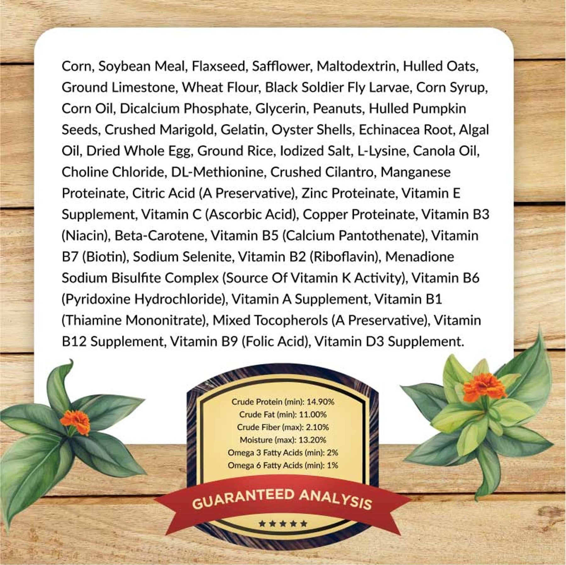 Corn, Soybean Meal, Flaxseed, Safflower, Maltodextrin, Hulled Oats, Ground Limestone, Wheat Flour, Black Soldier Fly Larvae, Corn Syrup, Corn Oil, Dicalcium Phosphate, Glycerin, Peanuts, Hulled Pumpkin Seeds, Crushed Marigold, Gelatin, Oyster Shells, Echinacea Root, Algal Oil, Dried Whole Egg, Ground Rice, Iodized Salt, L-Lysine, Canola Oil, Choline Chloride, DL-Methionine, Crushed Cilantro, Manganese Proteinate, Citric Acid (A Preservative), Zinc Proteinate, Vitamin E Supplement, Vitamin C (Ascorbic Acid), Copper Proteinate, Vitamin B3 (Niacin), Beta-Carotene, Vitamin B5 (Calcium Pantothenate), Vitamin B7 (Biotin), Sodium Selenite, Vitamin B2 (Riboflavin), Menadione Sodium Bisulfite Complex (Source Of Vitamin K Activity), Vitamin B6 (Pyridoxine Hydrochloride), Vitamin A Supplement, Vitamin B1 (Thiamine Mononitrate), Mixed Tocopherols (A Preservative), Vitamin B12 Supplement, Vitamin B9 (Folic Acid), Vitamin D3 Supplement.